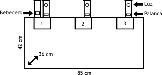 En los tres puertos se instalaron palancas y arriba de éstas a 9 cm del suelo se instaló un estímulo visual (tecla). Únicamente en el puerto sur se instaló a un lado de la palanca un bebedero. El registro de la ubicación espacial de las ratas se realizó con la delimitación de tres zonas (17 cm x 10 cm) del área de la cámara experimental dependiendo de su proximidad con los dispositivos de estímulo y respuesta (rectángulos 1, 2 y 3 en la Figura 1). La cámara se encontraba dentro de un cubículo de aislamiento acústico de color negro, mismo que contaba con dos ventiladores de 115W que proporcionaron ventilación y ruido blanco. La luz general fue proporcionada por un foco de luz negra-ultravioleta de 20 W. En la Figura 1 se muestran las medidas de la cámara experimental y la disposición espacial en la que se instalaron los dispositivos para la fase con mayor contigüidad espacial.