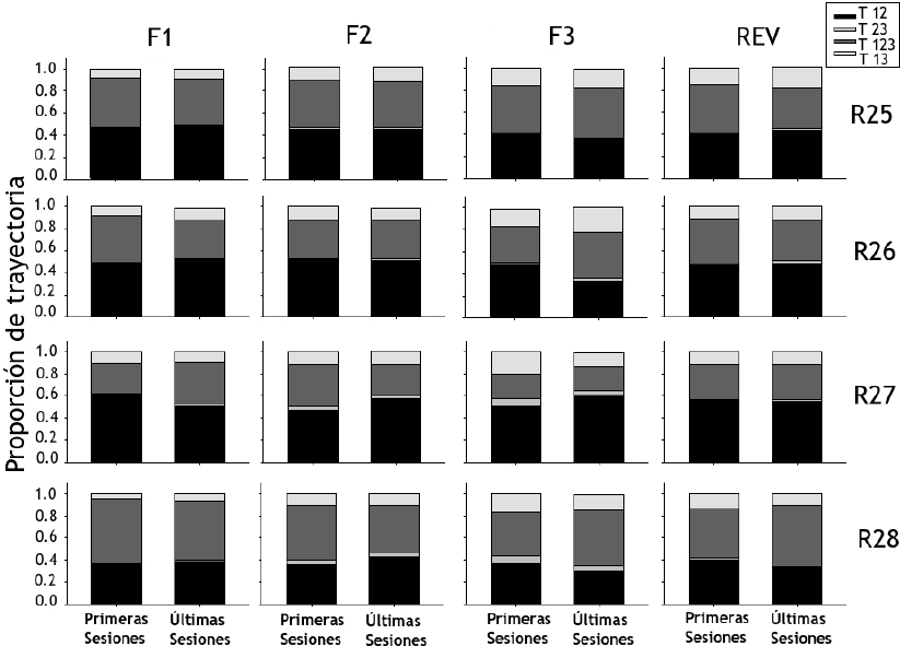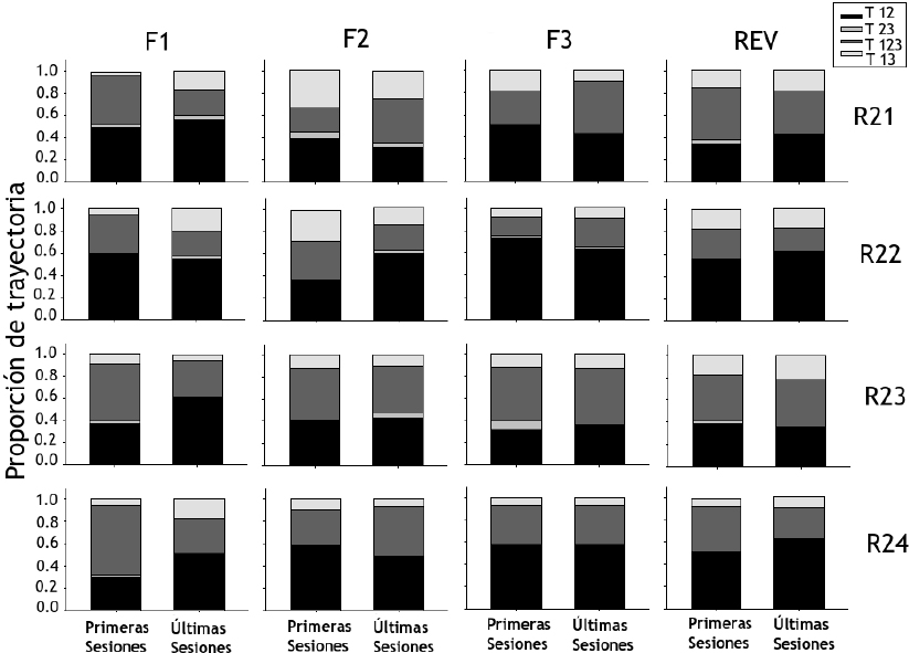 La Figura 2 muestra la proporción de trayectorias (ordenada) empleadas por las ratas del Grupo 1 para trasladarse entre las Zonas 1, 2 y 3 durante las primeras cinco y últimas cinco sesiones para cada fase (abscisa). Cada trayectoria implicó la entrada de la rata en las zonas de la cámara experimental para los siguientes casos, incluyendo en orden inverso: Zona 1 – Zona 2 (T 12), Zona 2 – Zona 3 (T 23), Zona 1 – Zona 2 – Zona 3 (T 123), Zona 1 – Zona 3 (T 13). En la Fase 1 se observaron mayores proporciones para el traslado de la Zona 1 a la 2 (Trayectoria 12) en todas las ratas, con excepción de las Ratas R23 y R24 que durante las primeras sesiones mostraron una mayor proporción por la Trayectoria 123 con valores que oscilaron entre 0.5 y 0.7. Para la Fase 2 no se observó alguna tendencia por emplear una trayectoria en mayor proporción, exceptuando la Trayectoria 12 para las Ratas R24 y R22 en las primeras y últimas sesiones de la fase respectivamente. En la Fase 3 las Ratas R22 y R24 mostraron una proporción mayor para la Trayectoria 12, mientras que en las demás ratas no se observó alguna tendencia por el empleo de una trayectoria. Este efecto se replicó en la fase de reversión.