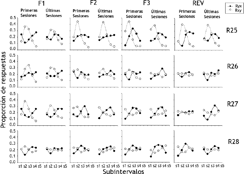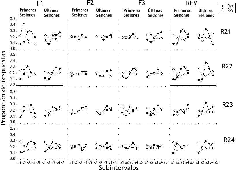 Con respecto a las Rxy, durante las primeras sesiones de la Fase 1 se observaron proporciones mayores en los Subintervalos 1 y 2 con 0.4 como el valor más alto, pero esta diferencia no se presentó durante las últimas sesiones de la misma fase. Este efecto se mantuvo relativamente estable durante las Fases 2 y 3 con valores próximos al 0.2. En la fase de reversión las respuestas se concentraron en los Subintervalos 1 y 2 con valores cercanos a 0.25.