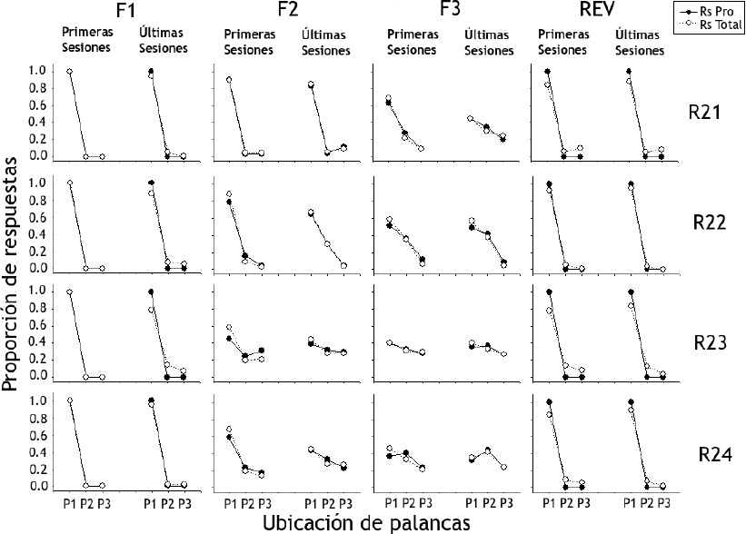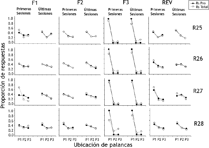 La Figura 7 muestra la proporción de respuestas de presión de palanca totales (Rs Total) y productoras de agua (Rs Pro) para las ratas del Grupo 2 (ordenada) según la ubicación de las tres palancas en bloques de las primeras y últimas cinco sesiones (abscisa). Al igual que en el Grupo 1, las proporciones de respuestas productoras y totales fueron similares para todas las ratas. Los efectos encontrados en el Grupo 2 concuerdan con el orden en el que las ratas fueron expuestas a las condiciones experimentales de acuerdo con lo observado para el Grupo 1, es decir, exceptuando la Fase 2 los efectos se dieron en orden inverso. Durante las Fases 1 y 2 las proporciones de ambos tipos de respuestas tienen valores similares para las tres palancas, mostrando proporciones ligeramente mayores para la Palanca 1 en comparación con las Palancas 2 y 3. Durante la Fase 3 la proporción de respuestas se concentró en la Palanca 1 para todas las ratas alcanzando valores cercanos al 1.0. La Rata R28 fue la excepción, pues para la proporción de respuestas totales mostró valores menores en comparación con las demás ratas. En la fase de reversión se replicaron los efectos mostrados durante la Fase 1.