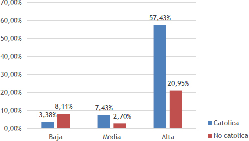 El análisis de tolerancia hacia la diversidad sexual basado en la religión mostró que la mayor proporción de estudiantes con credo católico tendían a ser más tolerantes que los que profesaban otras religiones como la evangélica (ver Figura 12).