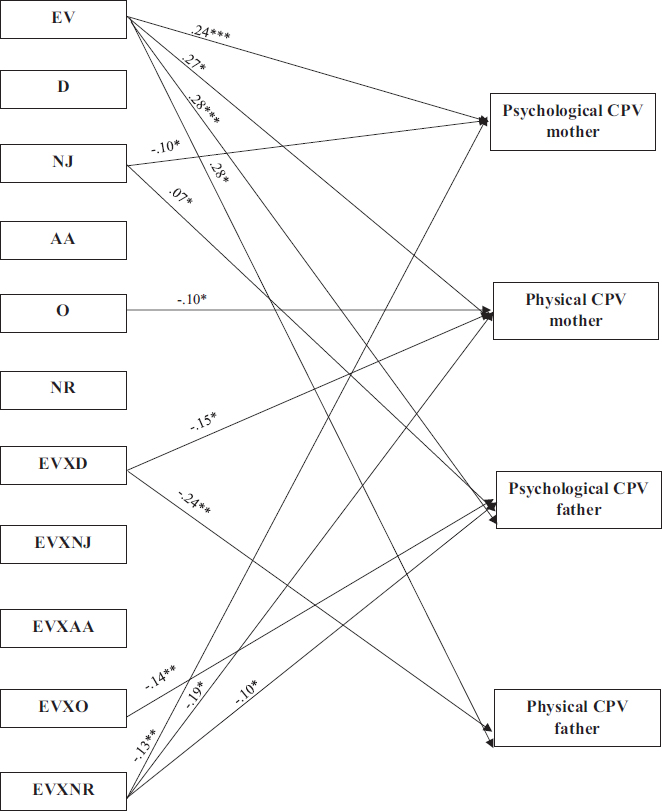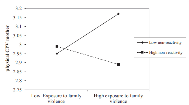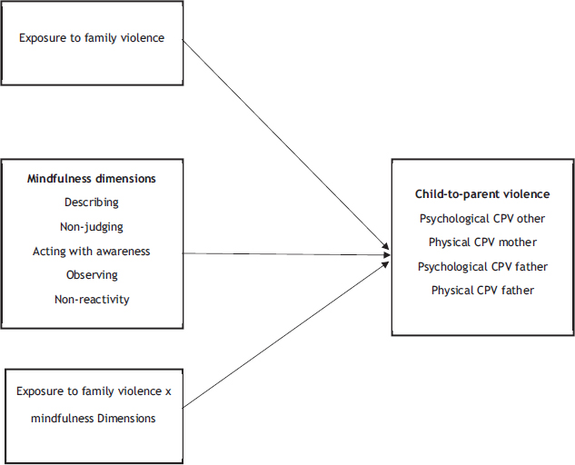 Correlation analysis among variables of the study and descriptive statistics were analyzed through IBM SPSS Statistics 26 (2012). structural equation model was carried out using version 8.80 of LISREL attending to the robust maximum likelihood method (rml). The paths were analyzed according to the Satorra-Bentler χ2-(S-B χ2) scale and requires the estimation of the variances and covariances. The hypothetical model presented direct paths from exposure to family violence and the five DM dimensions (describing, non-judging, acting with awareness, observing, and non-reactivity) to physical CPV toward mothers, physical CPV toward fathers, psychological CPV toward mothers, and physical CPV toward fathers. The model also included paths from interactions between exposure to family violence and the five dimensions of DM (exposure to family violence X describing, exposure to family violence X non-judging, exposure to family violence X acting with awareness, exposure to family violence X observing, and exposure to family violence X non-reactivity) to physical and psychological CPV toward mothers and fathers. Independent variables were transformed to z punctuations to generate moderation terms (Frazier et al., 2004). The adequation of the model was analyzed according to the fit indexes of the model: NNFI indexes were .90 or higher, RMSEA indexes were .06 or lower, and CFI indexes were .90 or higher; the model fit perfectly (Hu & Bentler, 1999).